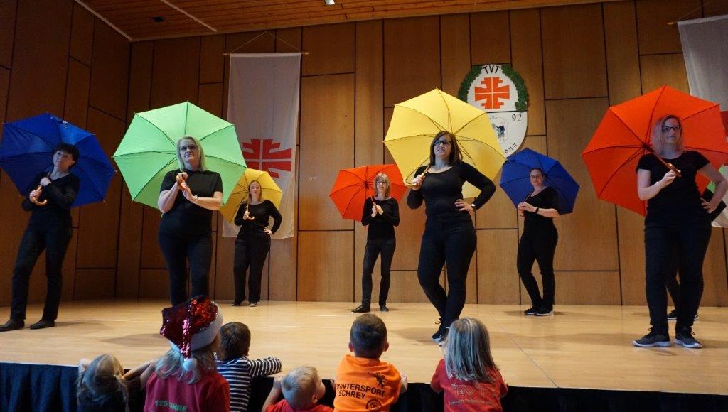 Die Frauengymnastikgruppe folgte auch im Jahr 2019 ihrer langen Tradition, beim Turnfestprogramm mitzuwirken. Bereits kurz nach den Sommerferien starteten sie mit den Proben zu ihrem Auftritt. Zur Musik von „Mary Poppins“ studierten sie einen Tanz mit Regenschirmen ein. Beim Turnfest wurde der Auftritt vom Publikum mit viel Applaus belohnt.