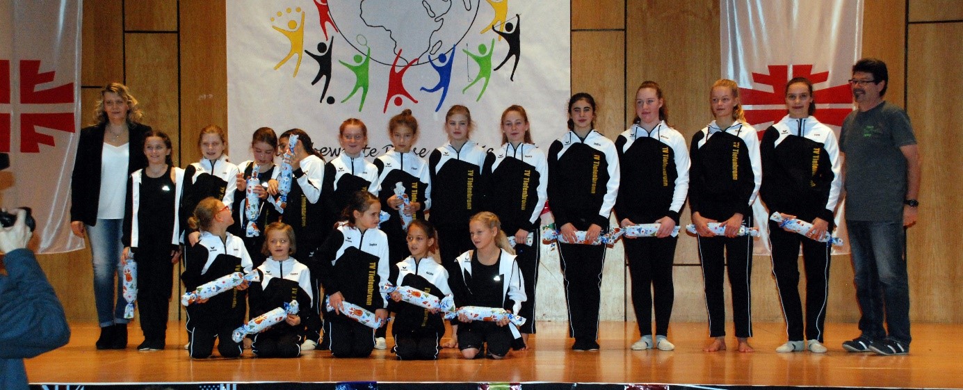 17 Turnerinnen konnten für ihre tollen Leistungen von den Vorstandsmitgliedern Marion Fröhlich und Oliver Schätz ausgezeichnet werden – Turnerinnen der Fördergruppe und vom allgemeinen Mädchenturnen. Als Anerkennung erhielten die Siegerinnen ein kleines Geschenk vom Verein.