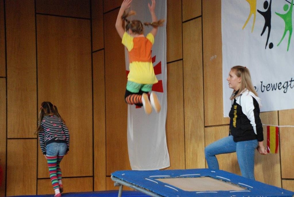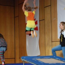 Mit einem „Hitmix“ zeigten die Turnerinnen (ab 4. Klasse, Trainerin Johanna Gase mit Alisha, Laura und Vivienne) ihr Können am Boden und Trampolin.