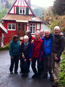 Wir trafen uns am Parkplatz beim Forcheneck und fuhren mit Privat PKWs trotz des anhaltenden Regens über Hirsau, Calw nach Kentheim. Dort parkten wir an der St. Kandidus Kirche und wanderten dann entlang des Rötelbachtals in Richtung Speßhardt. Von Speßhardt aus weiter in Richtung Zavelstein. Dort liefen wir durch das historische Altstädtchen zur Burg. Vom Turm der Burg hat man einen schönen Ausblick, sofern das Wetter mitmacht. Nach dem man sich dann von Ortsansässigen die historische Geschichte von Zavelstein kurz erläutern ließ ging es weiter zum Wanderheim Zavelstein.
