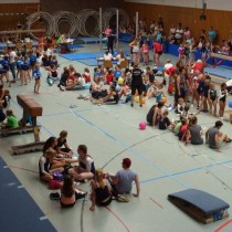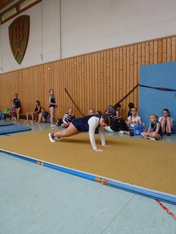 Nach einer kurzen gemeinsamen Erwärmung aller Aktiven, die in diesem Jahr von unseren Turnerinnen Laura Burgert und Vivienne Fröhlich durchgeführt wurde, startete der Wettkampf.