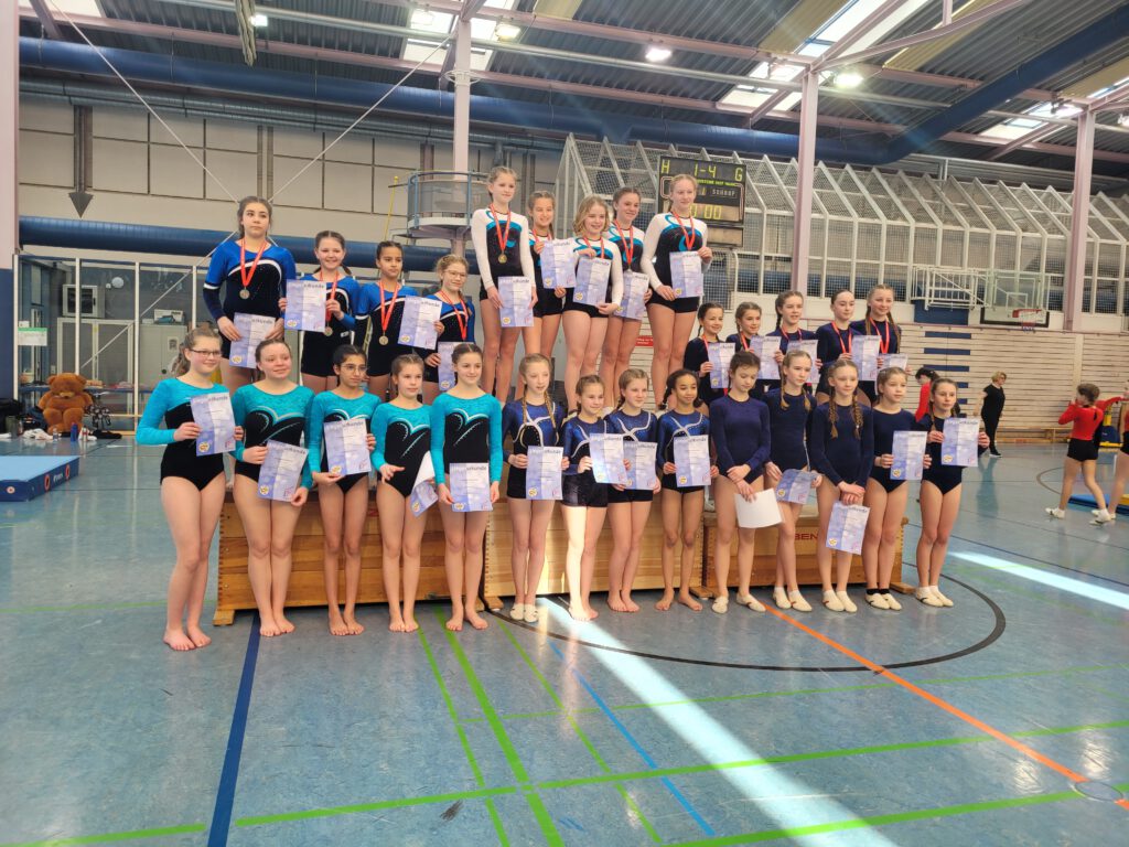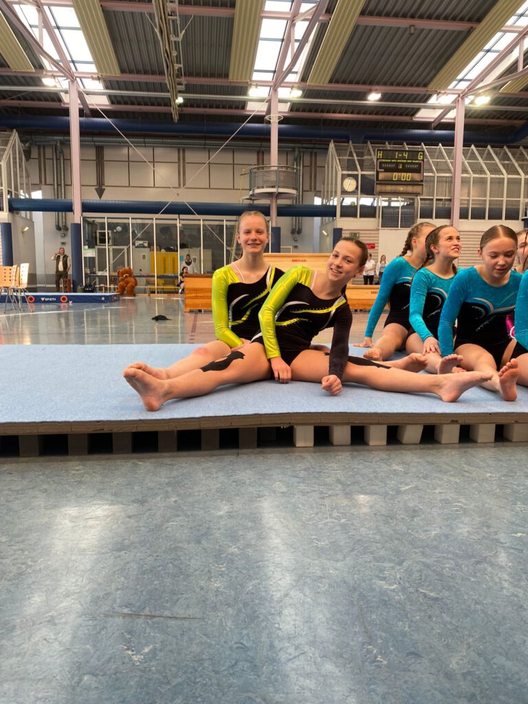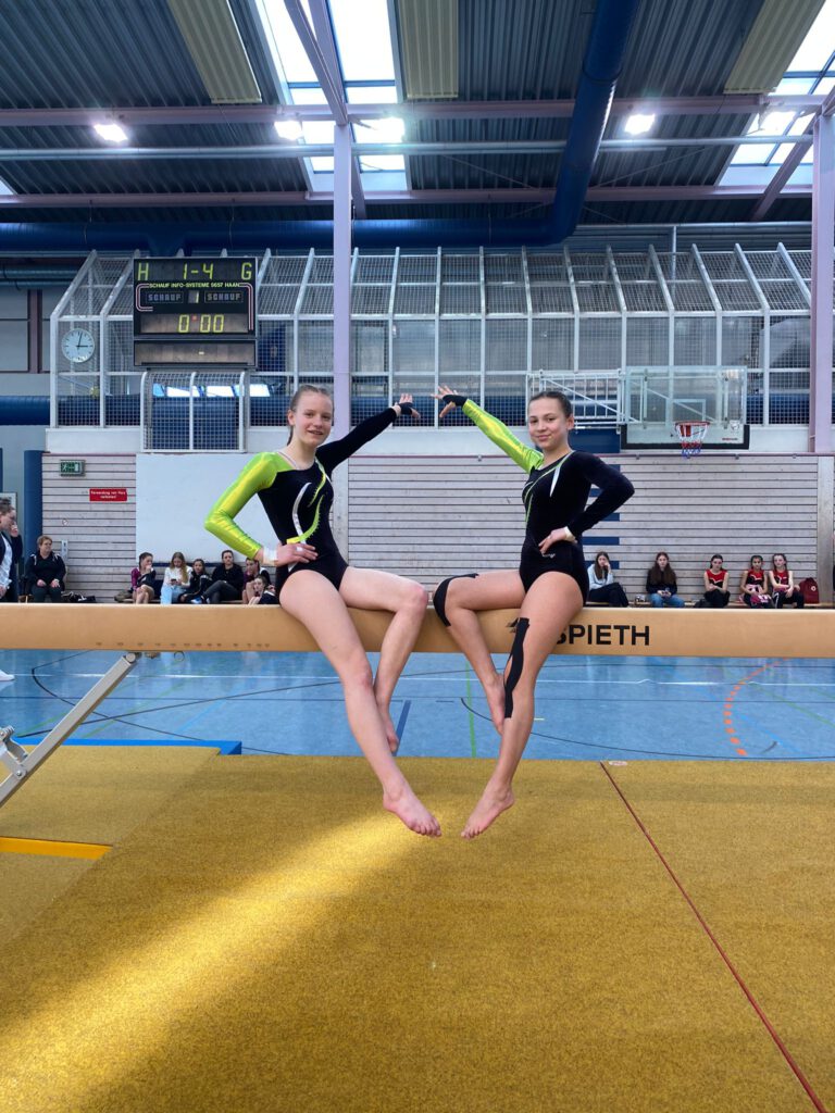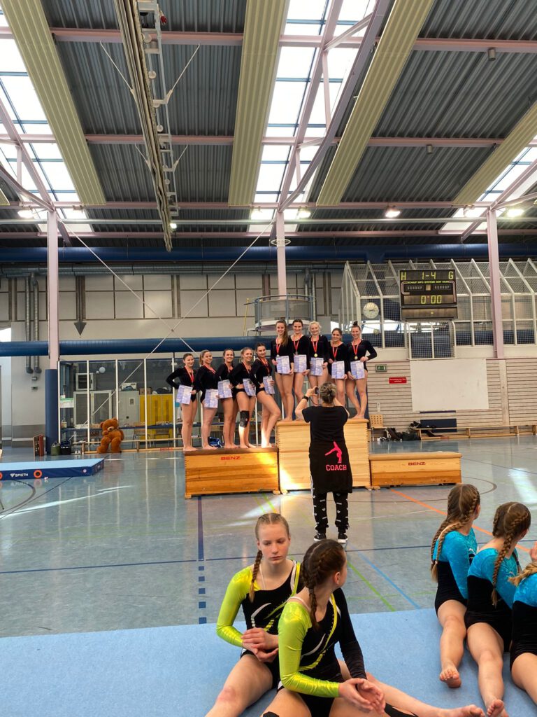 Direkt im Anschluss turnten die Mädchen in der Altersklasse 2009 und jünger. Leider musste die Mannschaft krankheits- und verletzungsbedingt auf zwei Turnerinnen verzichten. Nichtsdestotrotz entschlossen sich Hanna P. und Luisa anzutreten, jedoch außer Konkurrenz. Beide Turnerinnen turnten einen sehr souveränen Wettkampf und zeigten sehr gute Leistungen. Wir möchten uns an dieser Stelle bei Marie-Sophie Burgert bedanken, die die Betreuung der Mannschaft übernommen hat, da zeitgleich die zwei Mannschaften der ü18-Gruppe an den Start gingen.