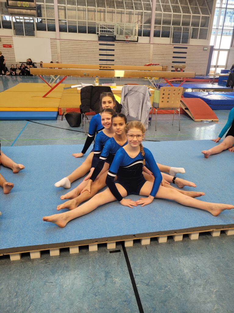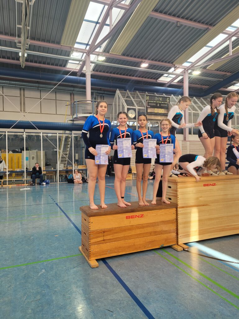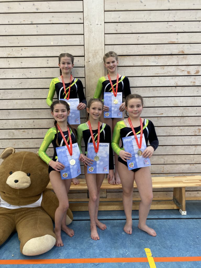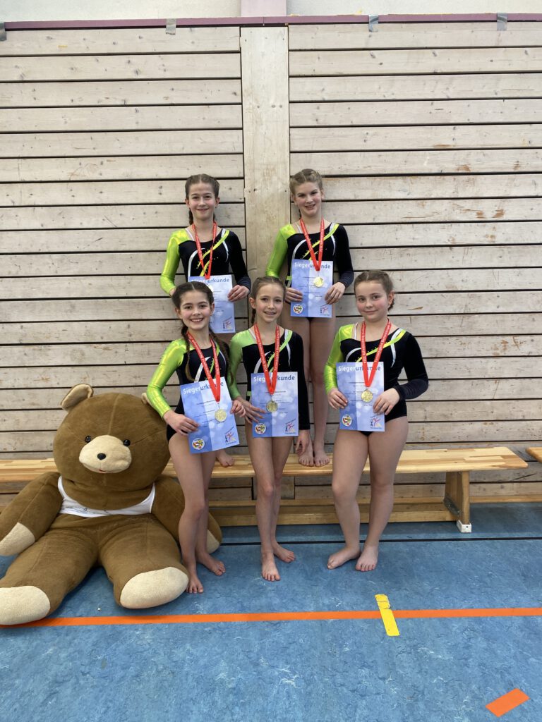 Am Sonntagvormittag ging es dann direkt weiter mit unseren Kleinsten. Nachdem alle Haare geflochten und alle aufgewärmt waren, starteten wir den Wettkampf in der Altersklasse 2013 und jünger. In diesem Jahrgang gingen insgesamt 10 Mannschaften an den Start. Nach einem starken Wettkampf und ohne Stürze, konnten sich Karoline, Mila, Lotte, Leni und Rebecca (v.l.) über ihre erste Goldmedaille freuen.