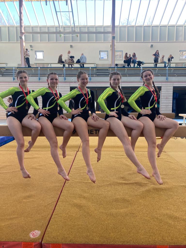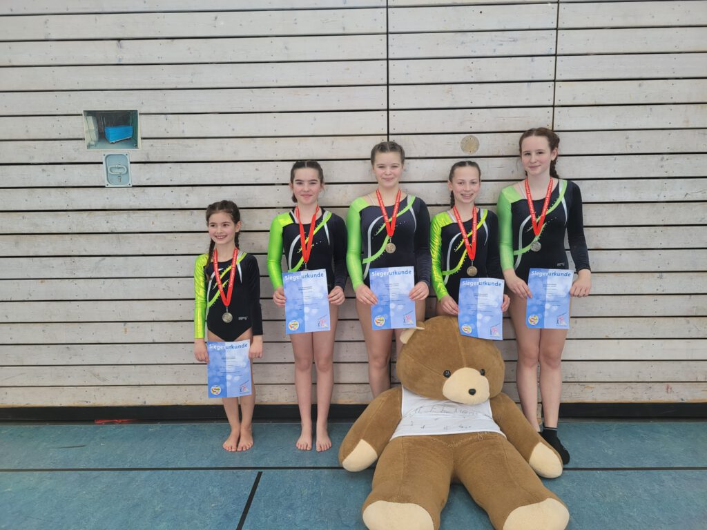 Am Sonntagvormittag ging es dann direkt weiter mit unseren Kleinsten. Nachdem alle Haare geflochten und alle aufgewärmt waren, starteten wir den Wettkampf in der AK 2012 und jünger. Nach einem starken Wettkampf und ohne Stürze, konnten sich Hanna, Cecilia, Natascha, Leni und Rebecca (v.l.) ihre erste Medaille erturnen und landeten auf Platz Zwei, mit nur 0,6 Punkten Abstand zur Goldmedaille.