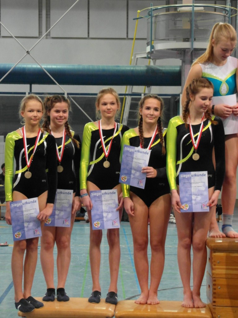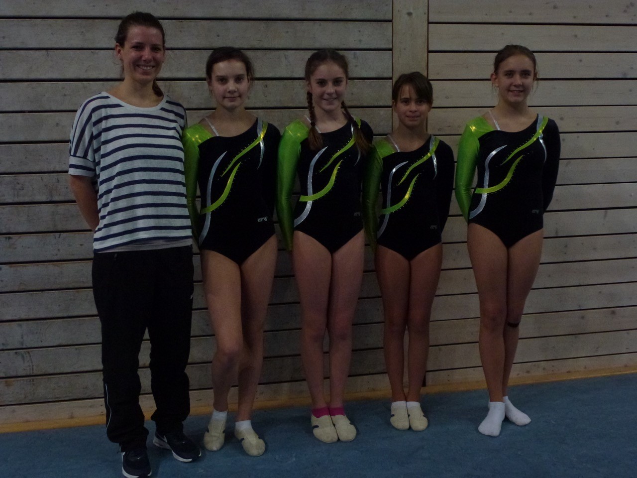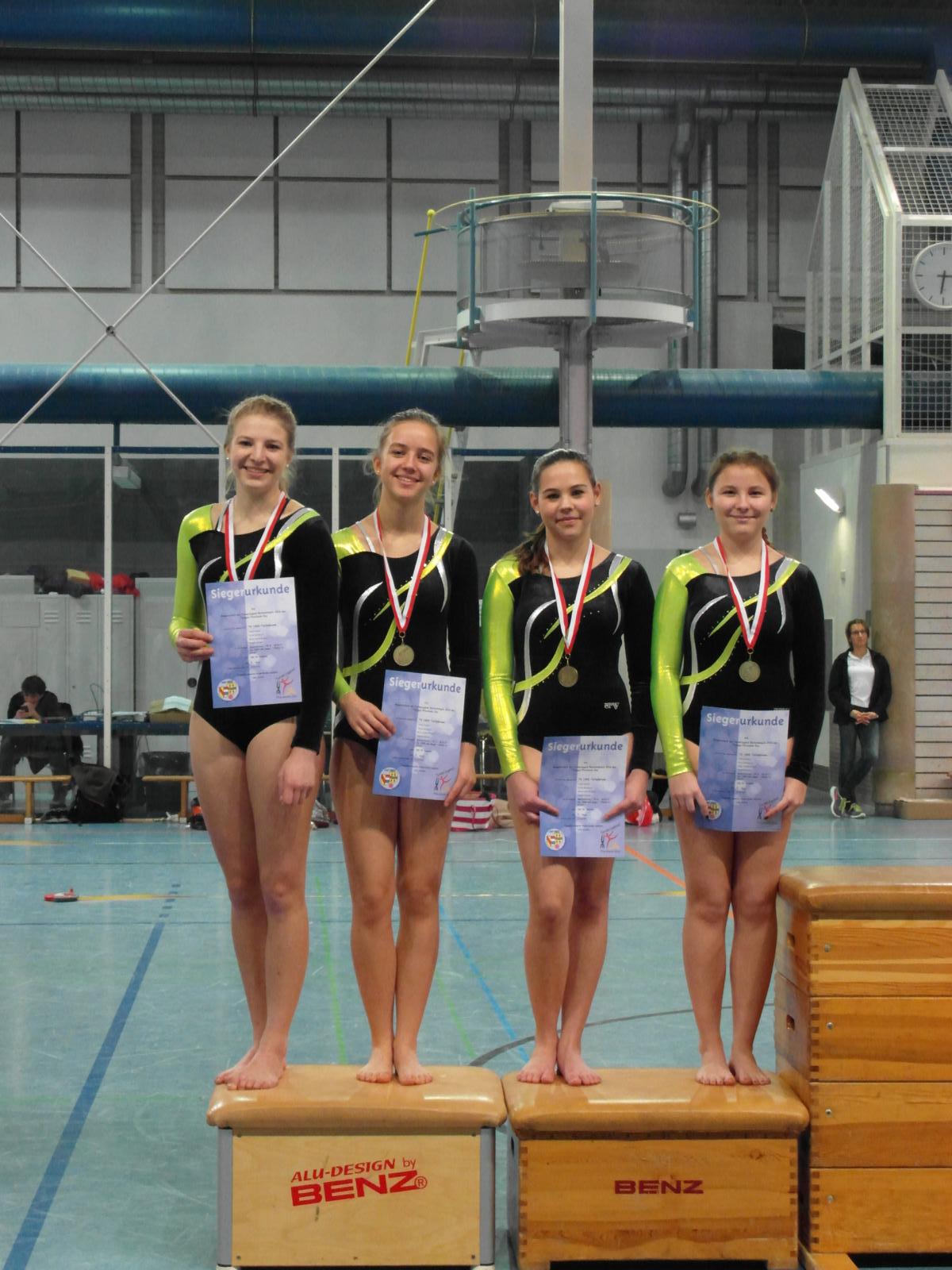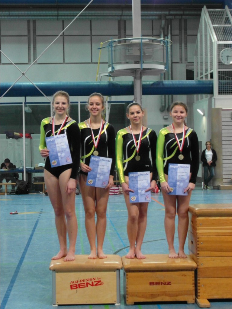 Auf wertvolle Punkte von Charlotte Rosar mussten die vier Turnerinnen leider verzichten, da sich Charlotte kurz vor dem Wettkampf verletzte. Somit ging die Mannschaft mit nur einer Streichwertung an den Start und errang einen tollen dritten Platz mit 10 Punkten Vorsprung zum Viertplatzierten und knapp 5 Punkte zum Zweitplatzierten.