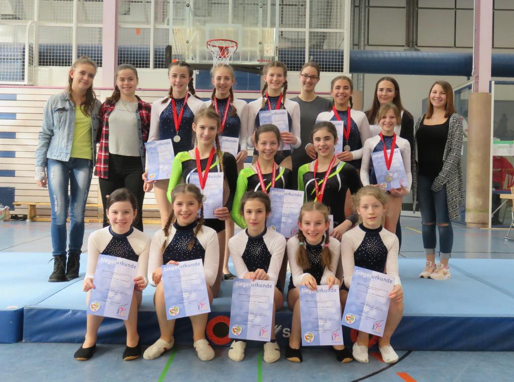 In der Altersklasse 2004 und jünger starteten zum einen Sophie Maier, Indira Lux und Leni Pälmer aus der Fördergruppe. Sie zeigten an allen vier Geräten (Sprung, Barren, Schwebebalken und Boden) gute Übungen und konnten sich somit bei der Siegerehrung über den zweiten Platz und die Silbermedaille freuen. Gleichzeitig gingen mit Sophie Burkard, Maja Wirnitzer, Clara Wirnitzer, Leni Weitmann und Mavie Lind fünf Turnerinnen aus dem Mädchenturnen an den Start. Es war ihr erster Geräte-4-Kampf und auch ihr erster Mannschaftswettkampf. Mit ihren neuen Trainerinnen Johanna Gase, Laura Burgert und Alisha Fimmler hatten sie in den Wochen zuvor fleißig die Übungen trainiert. Die Aufregung war groß. Und trotzdem konnten sie ihr Können den Kampfrichtern und den zahlreich angereisten Zuschauern zeigen. Nach Ende des Wettkampfes stand ein vierter Platz zu buche.