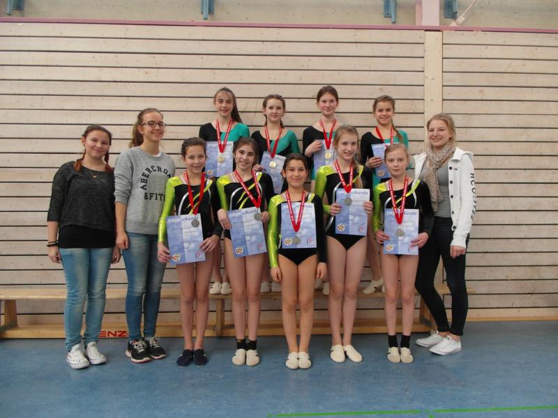 Diesem Wettkampf stellten sich in der Altersklasse 2003 und jünger zwei Mannschaften des TV Tiefenbronn. Die erste Mannschaft lieferte sich ein knappes Rennen mit der TG Stein. So lagen unsere Tiefenbronner Mädels am Sprung und am Barren noch auf Siegkurs, jedoch konnten sie diese Leistung am Balken und Boden nicht fortführen, sodass es bei der Siegerehrung „nur“ zur Silbermedaille reichte. Doch auch darüber freuten sich die Turnerinnen und Trainerinnen sehr.