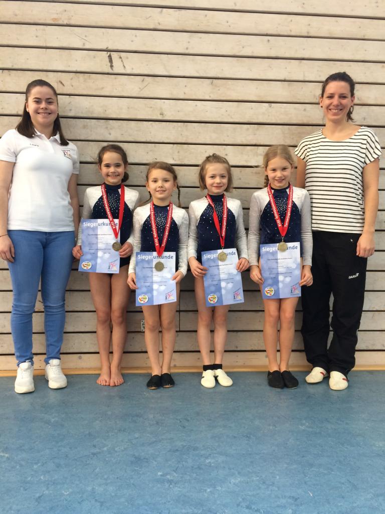 K1024_Bild 2Die glücklichen Bronzemedaillen-Gewinnerinnen v.l.: Sophie Werner, Laura Schüller, Emma Gallenbach und Emma Collmer mit Kampfrichterin Laura Burgert, Trainerin Verena Müller