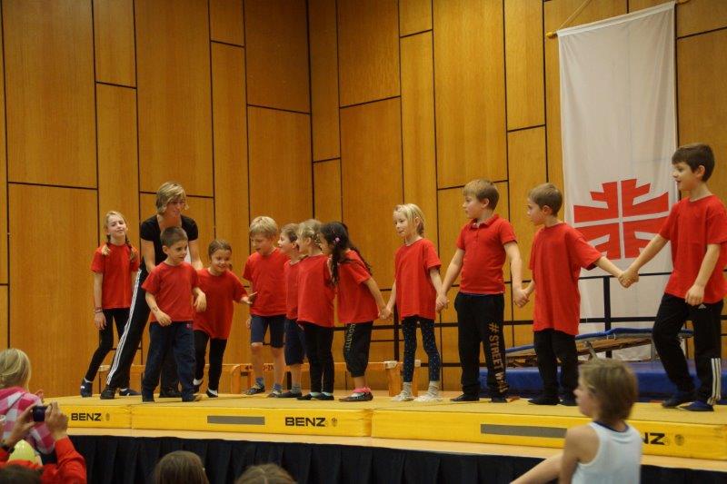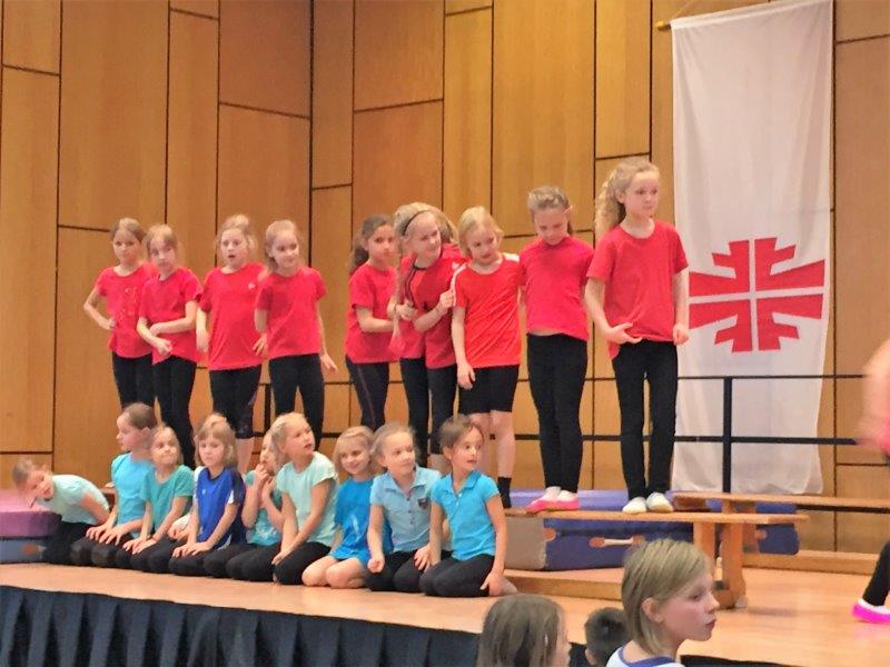 Anschließend zeigten die Turnerinnen (ab 4. Klasse – Trainerinnen Johanna Gase, Verena Müller, Laura Burgert) als „Springolinos“ ihre Vielseitigkeit am Kasten & Boden.