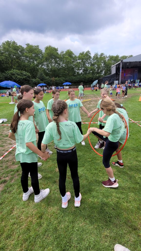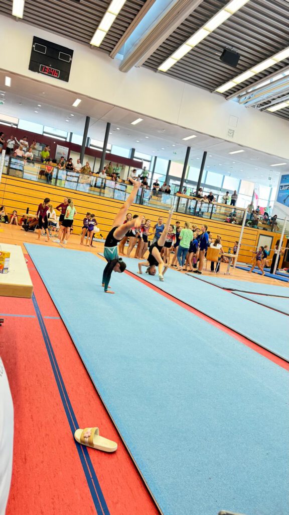 Nach einer erholsamen Nacht begann der Samstag entspannt: gemütliches Frühstück in der Schule, gemeinsames Aufwärmen und etwas Zeit, den anderen Teams beim Wettkampf zuzuschauen. Um 13:42 Uhr war es dann soweit – unsere Turnerinnen gingen in drei Mannschaften mit jeweils drei Mädchen in den Altersklassen 14 Jahre und jünger, 13 Jahre und jünger sowie 11 Jahre und jünger an den Start.
